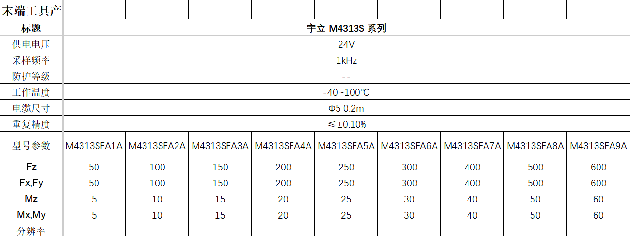 M4313SXX 系列工业级 6 轴力传感器,是协作机器人和工业机器人的理想选择。具有以下优点: 1.高精度。该系列传感器精度优于0.5%F.S。 2.抗冲击。高达5倍过载能力。 3.高可靠性。每个轴100次5倍过载后,传感器不失效。 4.优异的零漂性能。0.05%/10℃。 5.接口丰富。支持Ethernet TCP/IP,EtherCAT,RS485, RS232,USB等多种通信方式。ISO机械法兰接口。